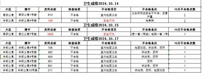 经校学生社区服务中心的检查,现对10月14日-10月18日卫生检查不合格的寝室予以公示,详见下表。