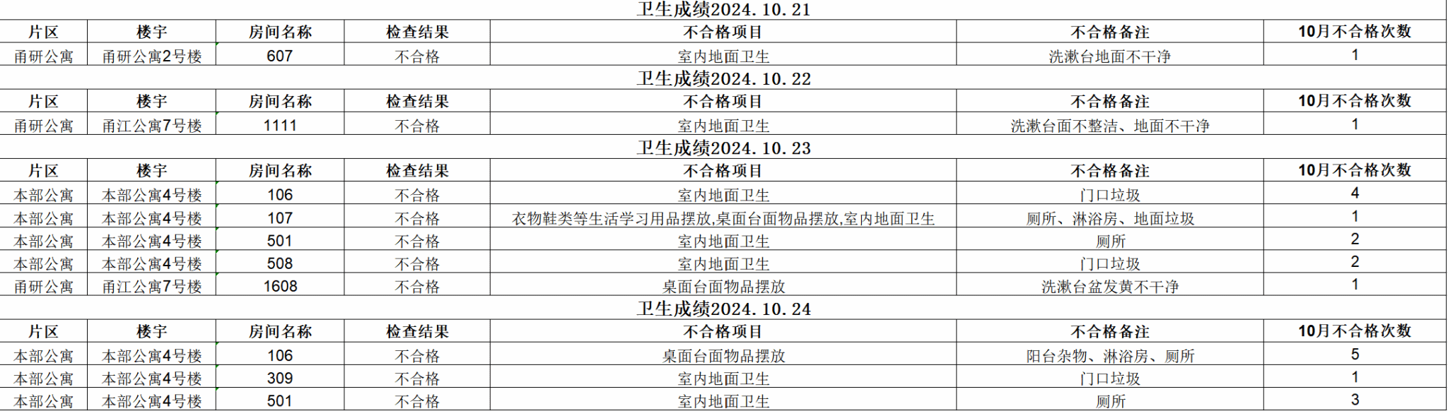 经校学生社区服务中心的检查,现对10月21日-10月25日卫生检查不合格的寝室予以公示,详见下表。