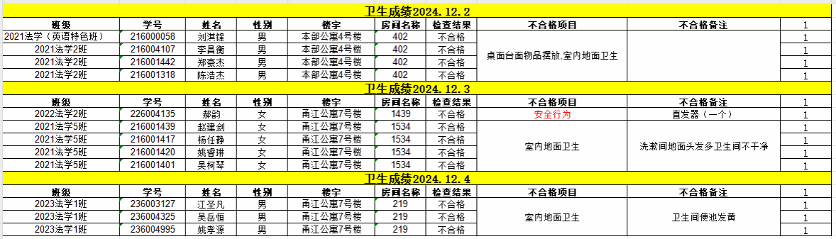 经校学生社区服务中心的检查,现对12月2日-12月6日卫生检查不合格的寝室予以公示,详见下表。