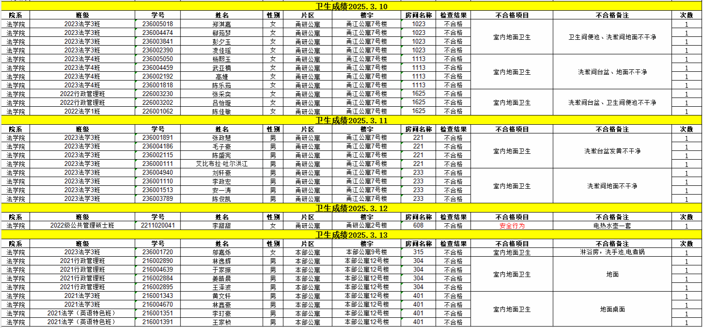经校学生社区服务中心的检查,现对3月10日-3月14日卫生检查不合格的寝室予以公示,详见下表。