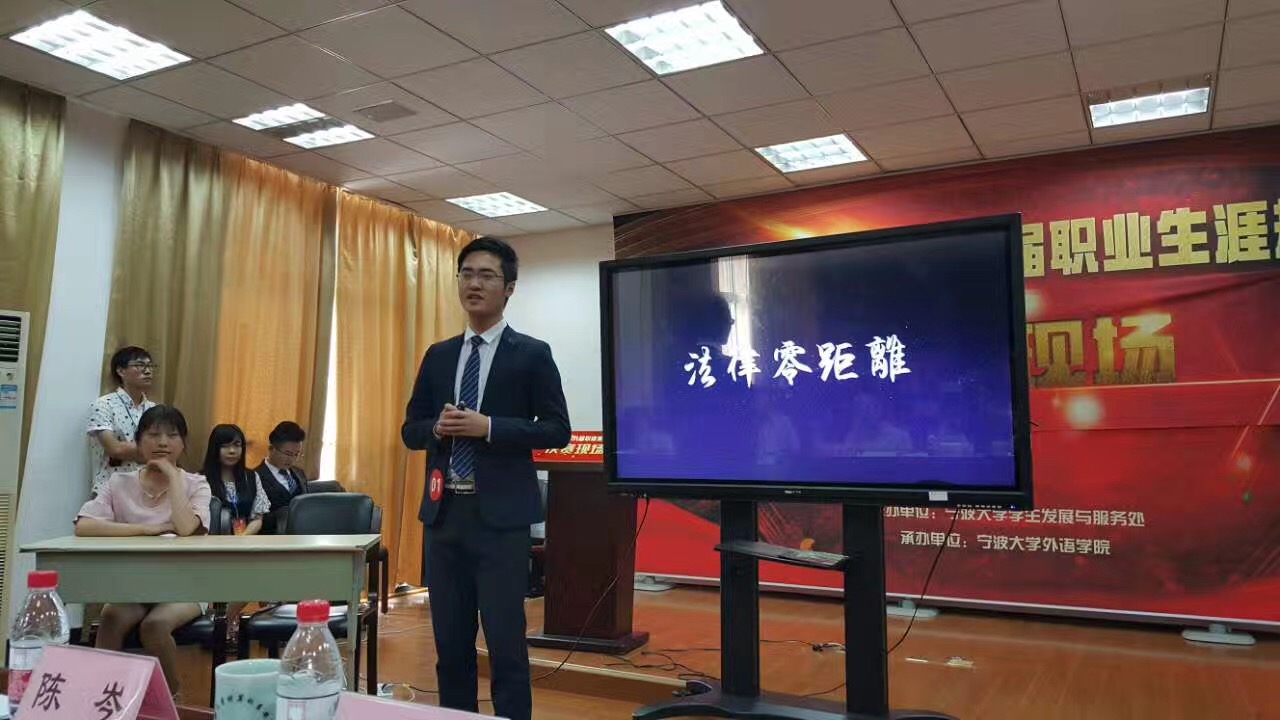 本次大赛全校共有102名选手参赛。经过前期文本评审、复赛选拔,共有20名选手进入决赛答辩。我院参赛选手俞竣文以“当兴趣撞上专业--一个法科学生的自白”为题,以“撒贝宁”、“我院2003级法学毕业生钱亮”为职业目标探析对象,经过全面的自我剖析、定位探索等,确定了成为一名法制节日主持人的规划。在职业体验感悟阶段,俞竣文结合近期热点的“校园贷”问题,给在场观众呈现了现场说法。邓瑶同学则以“公诉检察官”这一目标为职业选择。从人民的名义热播剧展开,她生动的介绍了公诉检察官这一职业形象,并且以湖北省的感动力量“程然检察官”为驱动,向观众中描述了自身坚定的检察官寻梦之旅。