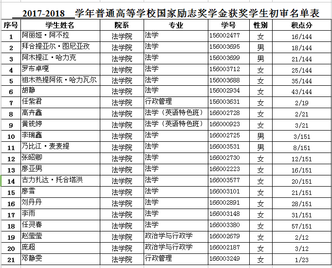 2017-2018学年抖阴 国家励志奖学金经学生本人申报、奖学金评选委员会资格审核、讨论,结合奖学金评定办法,最终拟推荐2017-2018年度国家励志奖学金名单公示如下: