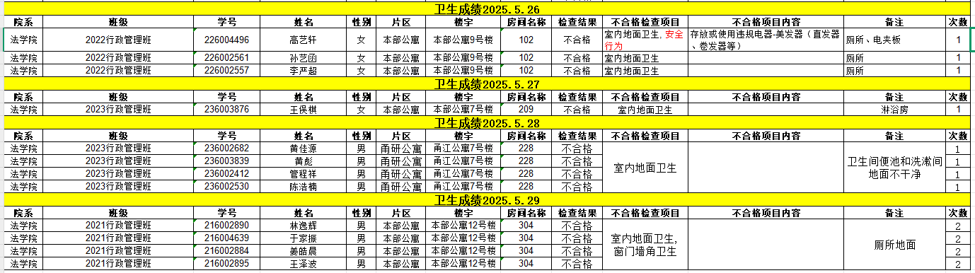 经校学生社区服务中心的检查,现对5月26日-5月30日卫生检查不合格的寝室予以公示,详见下表。