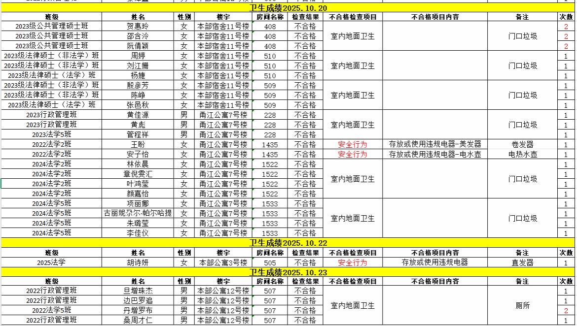 经校学生社区服务中心的检查,现对10月20日-10月24卫生检查不合格的寝室予以公示,详见下表。