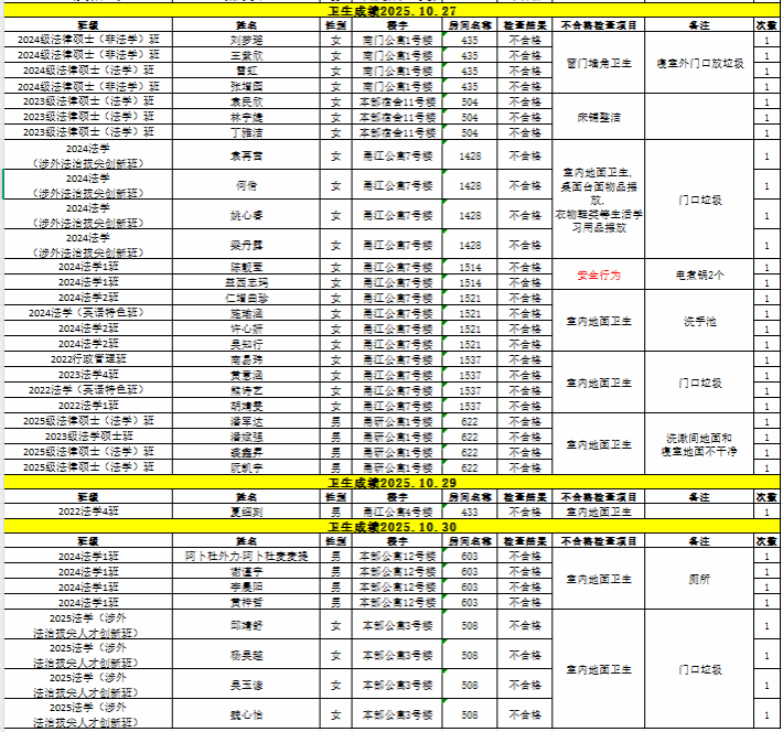 经校学生社区服务中心的检查,现对10月27日-10月31日卫生检查不合格的寝室予以公示,详见下表。
