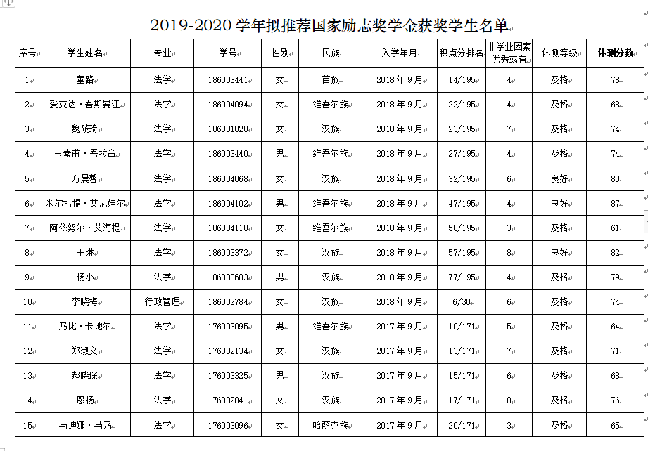 2019-2020学年抖阴 国家励志奖学金经学生本人申报、奖学金评选委员会资格审核、讨论,结合奖学金评定办法和学校下拨名额,最终拟推荐2019-2020年度国家励志奖学金名单公示如下:
