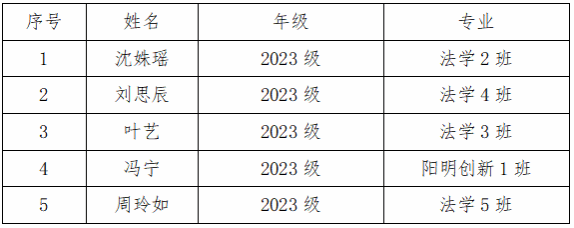 根据《关于开展第六届“金陵杯”模拟法庭竞赛校内选拔工作的通知》,经学生申请、现场案例分析面试,最终推荐以下5名同学作为抖阴 代表队参加第六届“金陵杯”模拟法庭竞赛。具体名单如下: