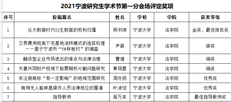 根据2021年宁波研究生学术节抖阴 分会场奖项设置、评定及奖励办法的通知,经现场评审,结合论文盲审成绩,现将第一分会场最终评定结果进行公示: