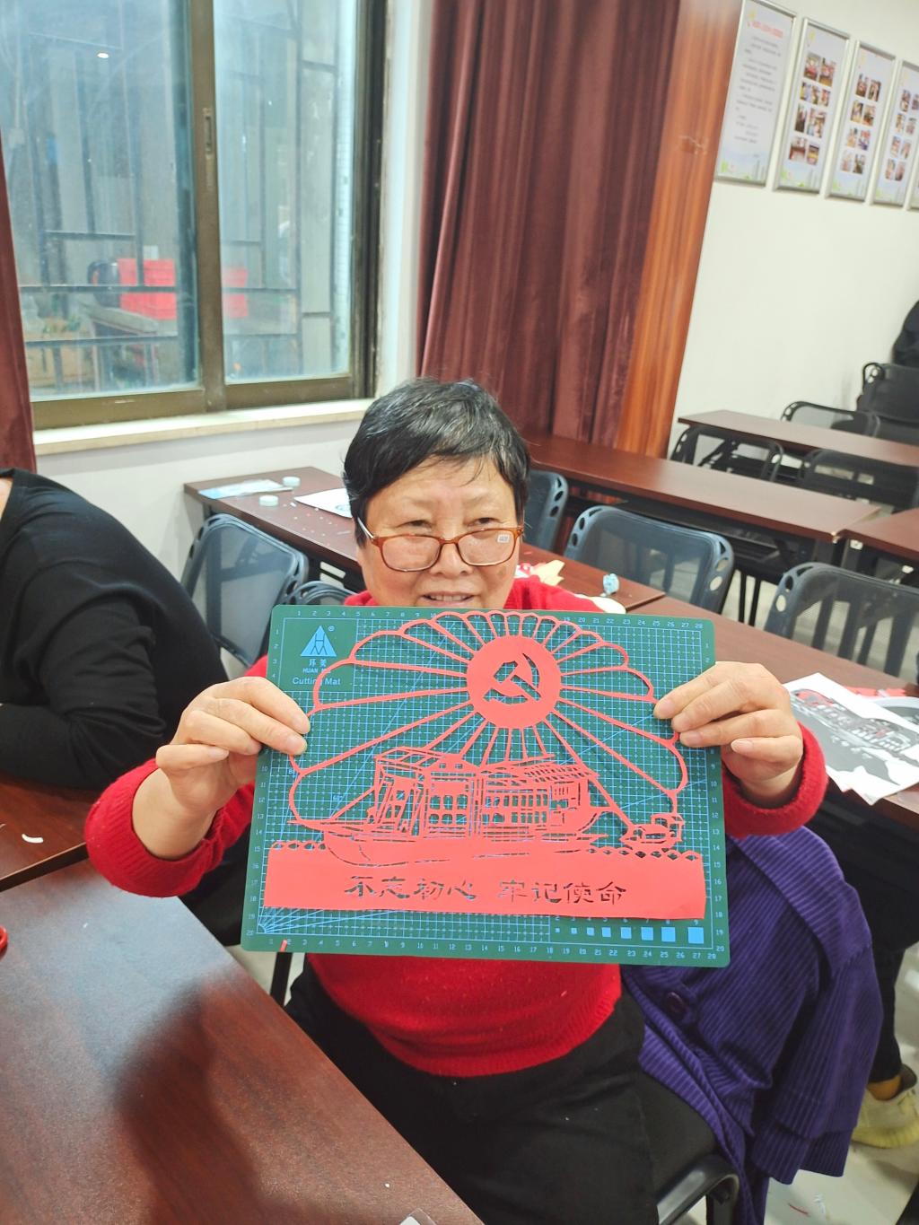紧接着,党员义工带领社区居民学习传统剪纸技艺和操作方法。一把刻刀、一张红纸、一双巧手,一幅幅栩栩如生的“红船精神”剪纸作品讲述着红色故事,带领大家游走于红色历史与传统文化的广阔天地,进一步发扬“红船精神”,学党史,悟思想,根植家国情怀。随后,大家一同观看了建党一百周年短片《百年恰是风华正茂》,弘扬革命精神,传承红色基因。