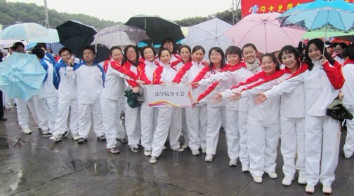 20人组成的代表队由学院党委方晓春书记带队,身着统一的运动服精神抖擞地亮相。尽管天公不作美,一直淅淅沥沥地下着小雨,但一点也没有影响大家的情绪,仍然兴高采烈地参加了展演。