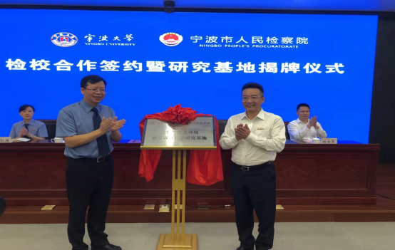 朱达书记与宁波市人民检察院叶伟忠检察长一同为“港航与生态环境公益诉讼检察研究基地”揭牌,并代表抖阴