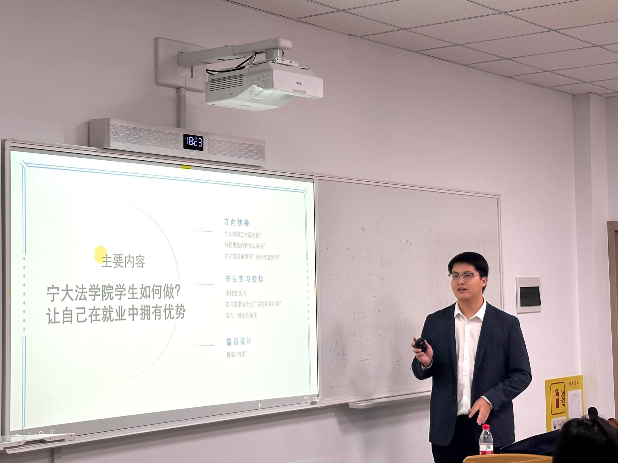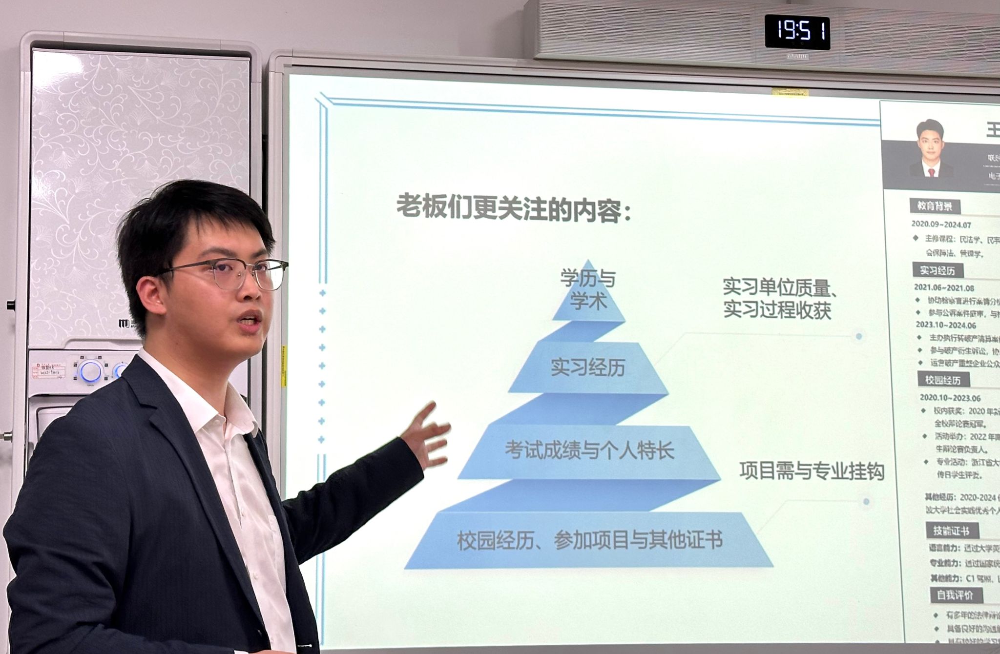 在地理条件和师资力量方面具有的优势。接着,他向同学们介绍了法学专业学生毕业后的热门就业单位,讲解各单位之间的差异性,同时进行利弊探讨,引导同学们认清就业现状和改变以往偏见。他在指导过程中多次强调实习实践的重要性,不仅有利于将理论知识转化为实践操作,还为未来参加工作奠定了坚实的基础。最后,王毅学长向在场同学讲解了简历的书写要点、排版要求以及内容优化方法,同学们纷纷表示受益匪浅。