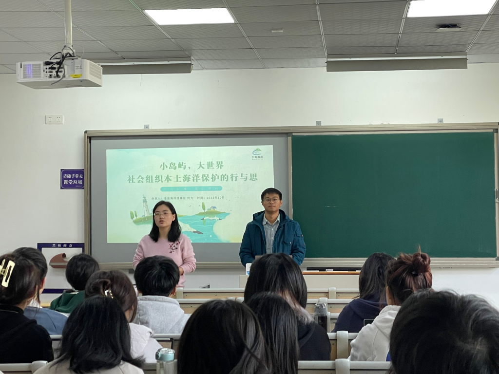 接下来,何老师从气候变化产生影响的角度展开介绍,以由表及里的方式引出舟山群岛的海洋环境保护问题,并对舟山千岛社会组织的发起原因、具体工作开展、工作成效以及面临挑战等展开介绍。何老师表示,蔚蓝海洋很美,但是我们现在真正深入了解海洋时就会发现,这片蓝色海洋还面临着海洋垃圾难以清理、海洋污染导致物种灭绝、环境破坏带来经济损失等问题。而公益机构无大小之分,都能贡献海洋环境保护的力量。随后,何老师对千岛海洋环保公益组织的运营模式与组织架构进行了详细介绍,让同学们了解到社会组织及其链接的志愿者们参与环保活动的方式,重点从“财、侣、法、力”四个角度分析如何一步一步脚踏实地将海洋环境保护资源链接、海洋环保宣传、净滩活动、垃圾源头减量等行动落到实处。