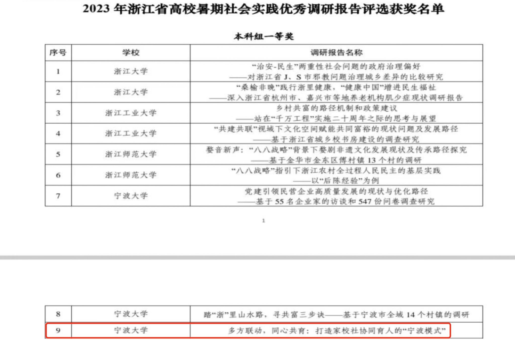日前,2023年浙江省高校暑期社会实践优秀调研报告评选决赛在我校举办。经书面评审、现场答辩等环节展示,我院《多方联动,同心共育:打造家校社协同育人的“宁波模式”》暑期社会实践团队项目荣获本科组一等奖。