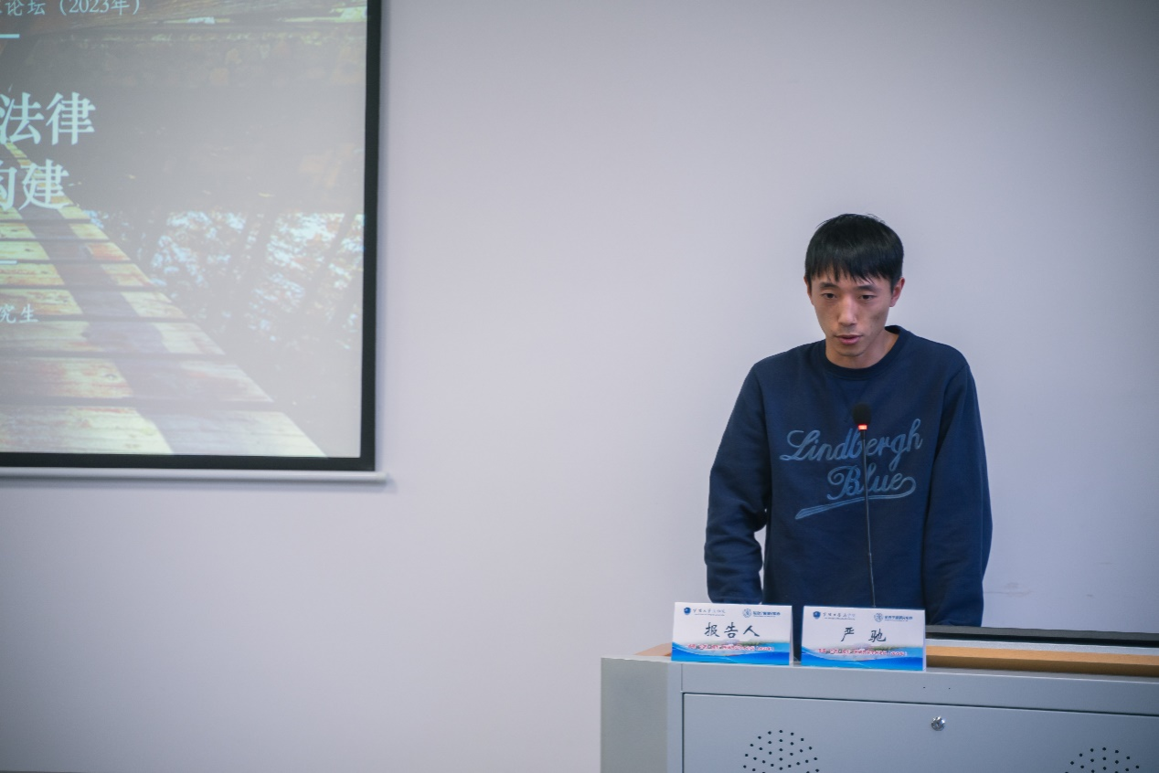 硕士研究生施兆祎进行报告。张首君报告的主题是《一个中国式法治现代化的新理论——法律三元结构论》。他从弗洛伊德的人格三分结构——本我、自我与超我出发,将其应用到法律中,指出法律亦有“本我”、“自我”与“超我”,阐明了法律本体论意义上的三元结构,初步建立起一个中国式法治现代化的新理论——法律三元结构论的框架。施兆祎报告的主题是《“以人民为中心”的法治观及其实现》。她阐述了“以人民为中心”的法治观在承继马克思主义法治“人民主体”立场的基础上,如何充分吸收中国传统法律思想精华和西方法治经验,进而深入到国家生活和社会生活的方方面面,指导中国法治实践的顺利进行。