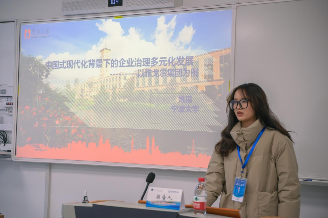 硕士生林敦金进行报告。姚瑶报告的主题为《中国式现代化背景下的企业治理多元化发展》,其在中国式现代化提出的未来治理新要求背景下,针对服装巨头雅戈尔的多元化经营模式存在的问题展开讨论,再通过PEST、SWOT等模型对其宏观环境和战略情况进行具体分析,为企业多元化战略在现代化治理模式下的发展奠定了基础。林敦金同学报告的主题为《容错纠错理念的理论孕育与实践发展》,其论述了容错纠错理念的理论孕育与实践发展,厘清容错纠错的孕育脉络,考察机制的源流,并在理论于实践的检验中充分挖掘机制的“生长空间”,进而借助“纪法衔接、纪法贯通”以及“四种形态”等思维工具,探明理论的深层次实践转化路径以助力国家治理现代化的实现。