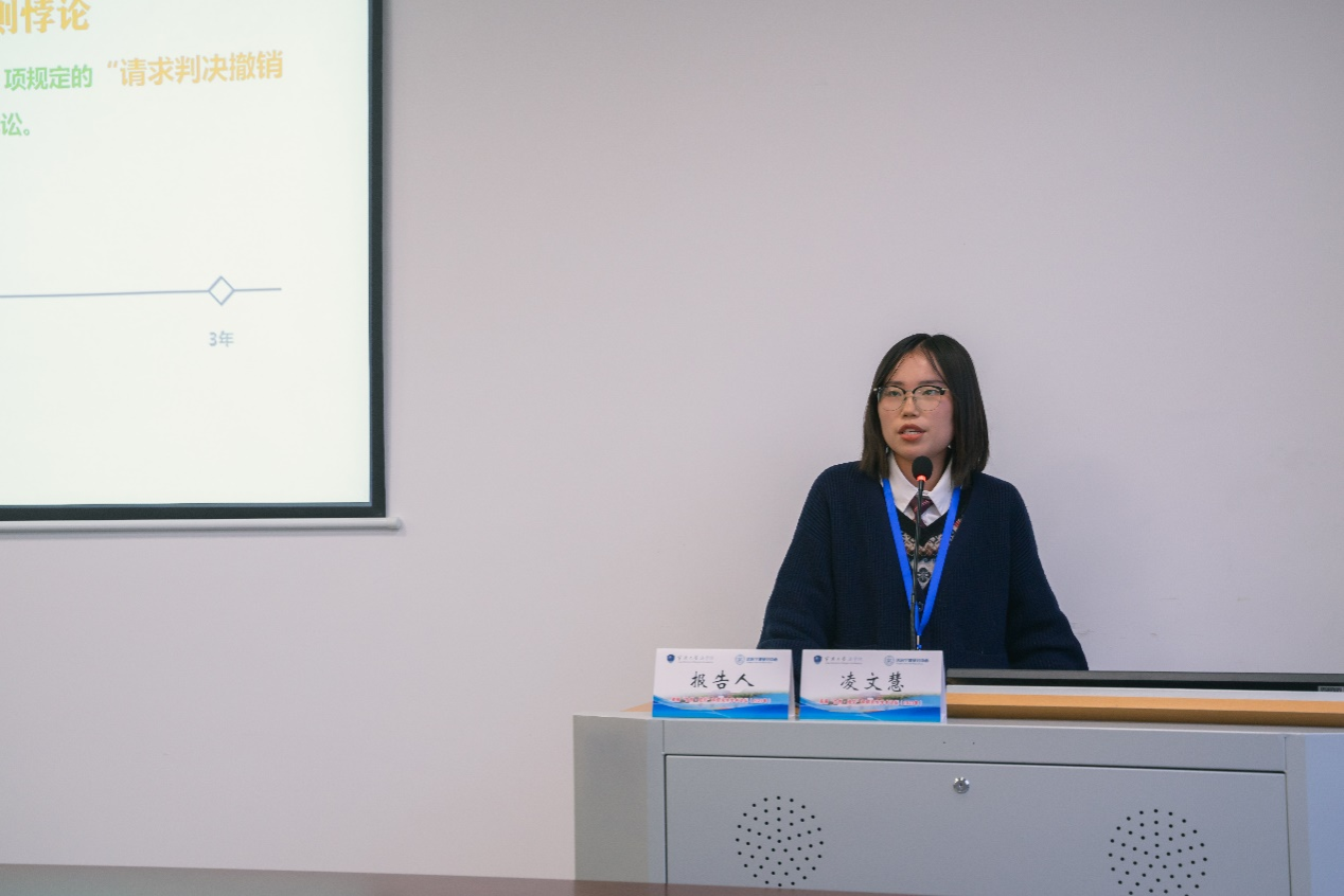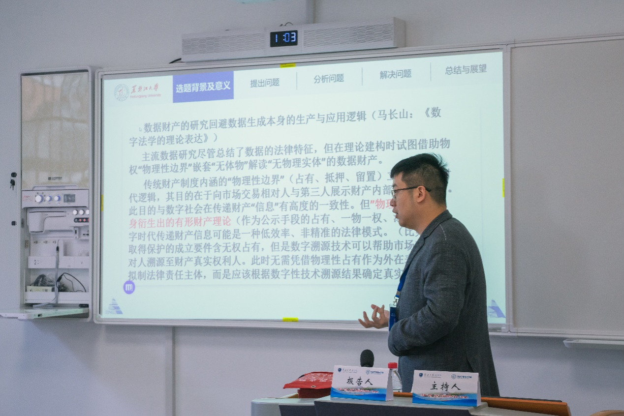 硕士生刘思婷进行报告。孙梦龙报告的主题为《数据财产新论——基于“物理性”到“信息性”的视角变迁》,其从“物理性”到“信息性”的变迁这一视角来分析数据财产,认为数据财产研究需要以法律关系为理论基础,以“模块化信息”为理论工具,重新构建数字时代民事财产的法律内涵。刘思婷报告的主题为《三层选排法在个人信息侵权责任认定的适用》,其以三层选排法为理论工具,将其应用于个人信息侵权责任的认定,以推动实定法评价在社会现实的逻辑框架由“要件-效果”模式转向“弹性规范+动态构造”模式,进而实现有效平衡法之安定性与客观现实生活的多变性,达到对个人信息侵权的全面保护。