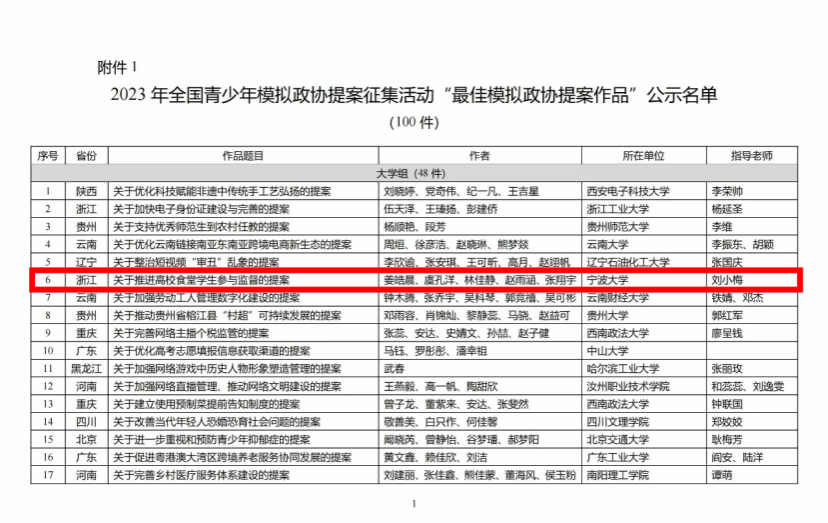 近日,由共青团中央维护青少年权益部、全国学联秘书处联合开展的2023年全国青少年模拟政协提案征集活动,经省级推报、全国遴选等多项流程,现已完成公示。我院学子负责撰写的《关于推进高校食堂学生参与监督的提案》成功入选“最佳模拟政协提案作品”。