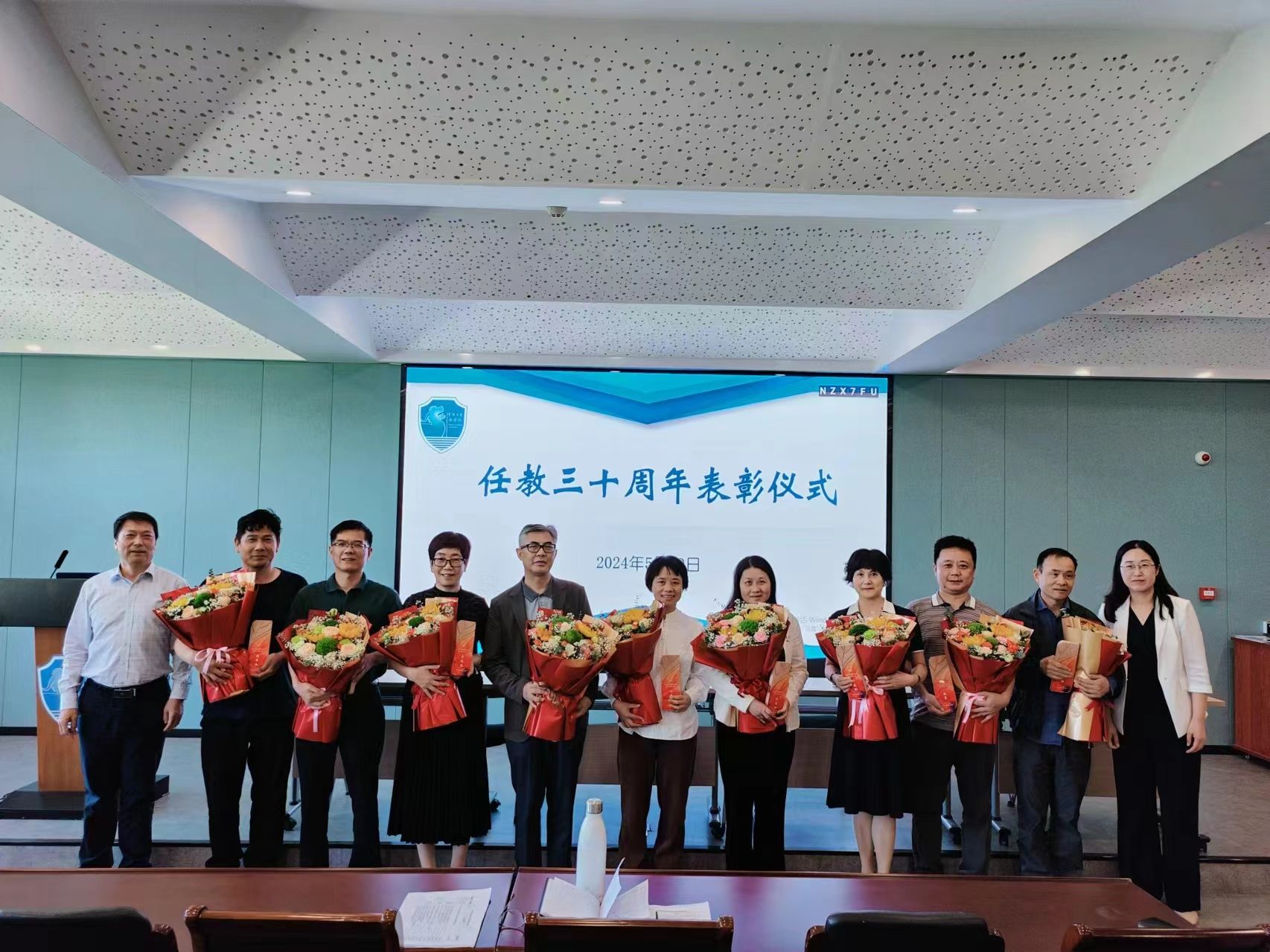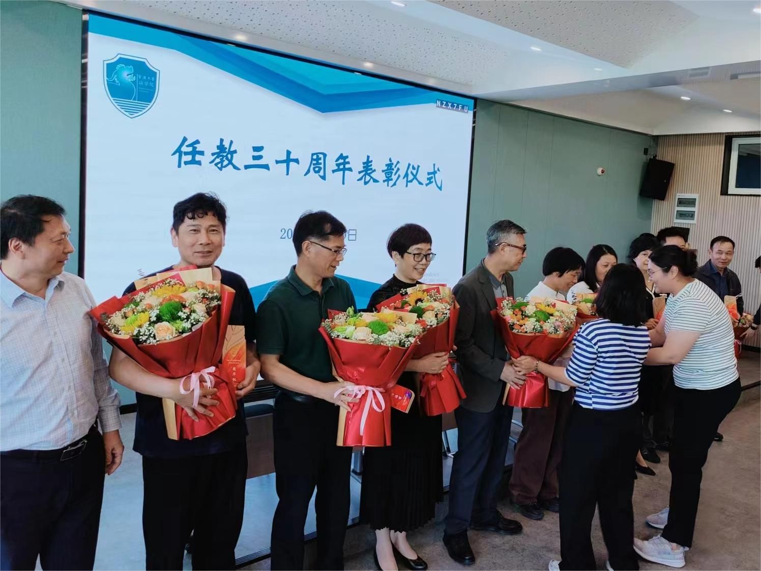 会上,孙芬娜书记宣读从教三十年受表彰教师名单,梁开银院长和工会主席王伟分别为受表彰教师颁发荣誉奖章,学院青年教师献上鲜花并合影留念。