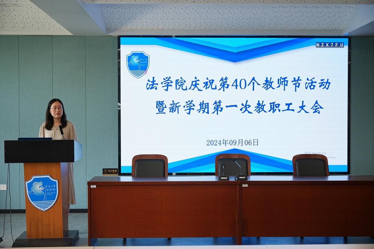 在包玉书楼217会议室隆重举办了庆祝第40个教师节活动暨先进表彰会。本次大会由学院党委书记孙芬娜主持。会议对2024年学校优秀共产党员、优秀党务工作者、最美教授以及学院第十九届“吾爱吾师”我最喜爱的老师等获奖者进行了表彰,就新学期工作进行了部署。