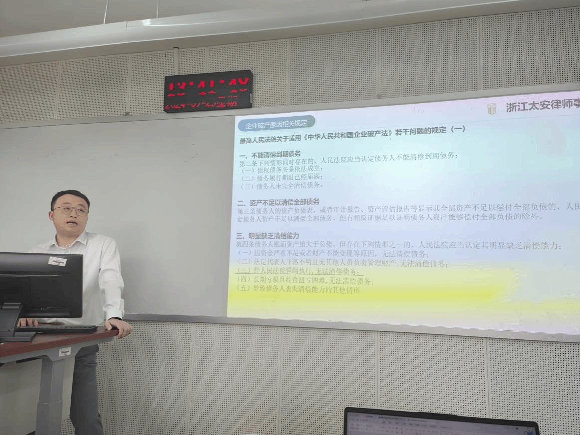 作为商法总论校企共建课程的延续,商法课程组邀请浙江太安律师事务所高级合伙人陈天翔律师就破产原因、破产程序启动相关问题为同学们做理论讲解和实务分享。