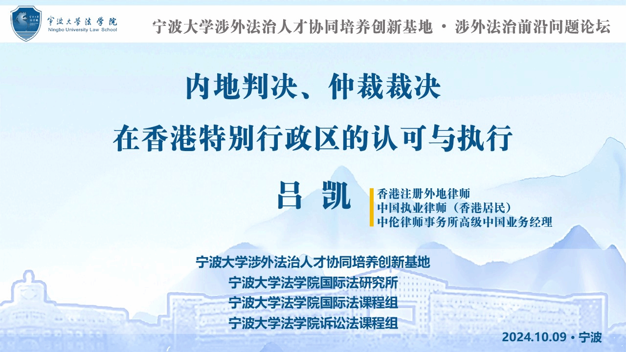 10月9日晚,由国际法课程组和诉讼法课程组合力推动的浙东法学讲坛第四十八讲暨涉外法治前沿系列(三)“内地判决、仲裁裁决在香港特别行政区的认可与执行”讲座在抖阴