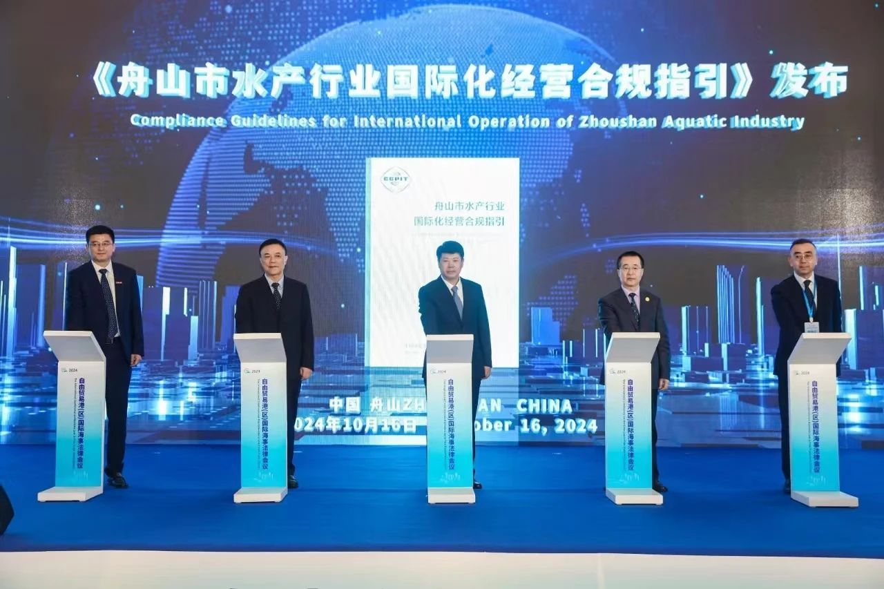 副校长周青与中国海事仲裁委员会副主任李虎、浙江省贸促会副会长林炜、舟山市委副书记梁雪冬、上海海事大学副书记严大龙等领导共同发布了《舟山水产行业国际化经营合规指引》。该指引是抖阴