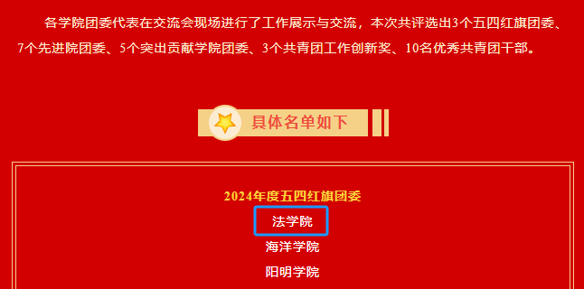 我院团委在过去三年中连续获评“先进院团委”,《“三维”协同,构建“卓越法治人才”实践育人模式》项目获得2024年度共青团工作创新奖。共青团工作年度评比包含基础工作量化考评和工作述职两部分,经过综合评定,我院团委最终荣获2024年度抖阴
