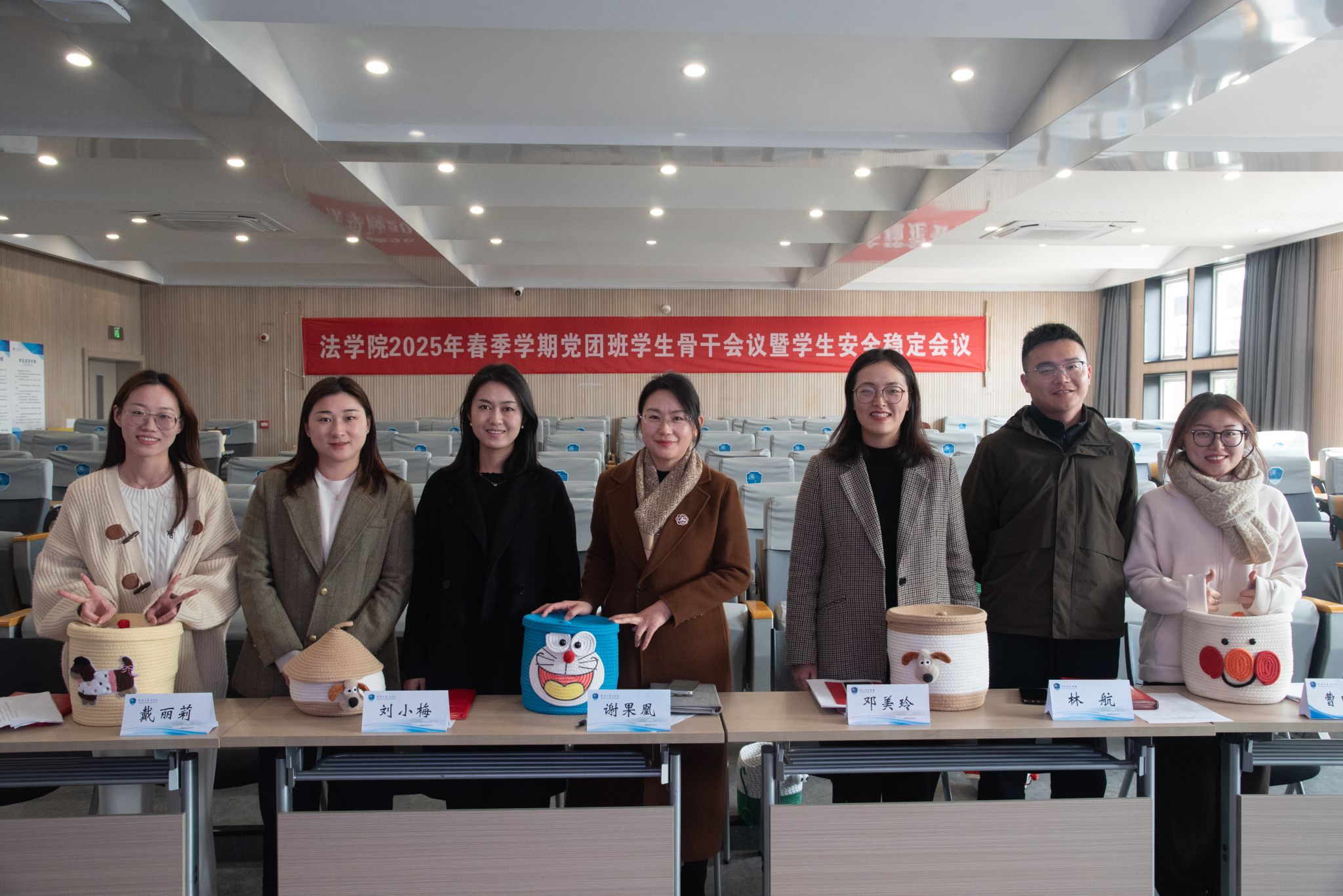 为表达对学生干部的关心与鼓励,学院特别准备了精美的编制收纳筐作为礼物。最后,全体参会人员合影留念,为本次会议画上了圆满的句号。
