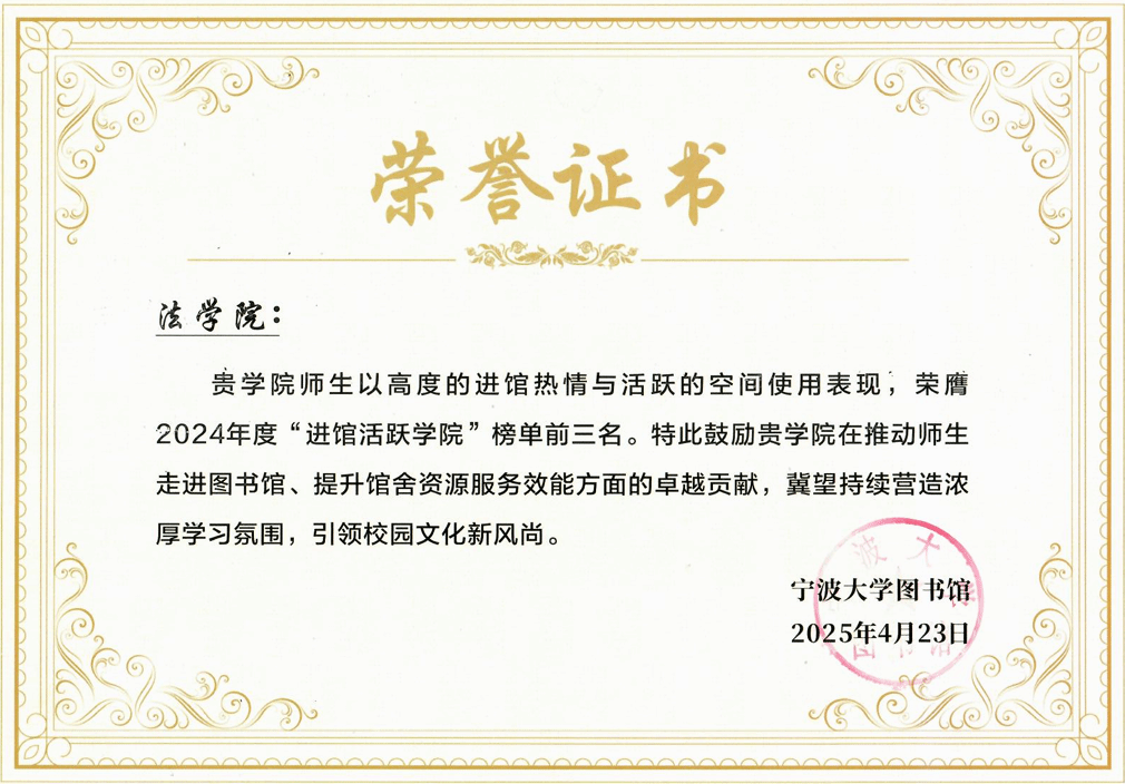 载誉而归,一举荣获 2024 年度 “进馆活跃学院” 榜单前三名以及 “书香学院” 借阅榜单前三甲两项殊荣。