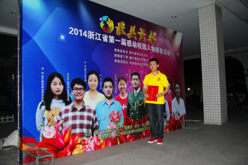 据悉,本次“最美青春——浙江省第一届感动校园人物”评选活动由浙江省教育厅、浙江广电集团联合组织开展,旨在发掘、宣传大学生学习实践社会主义核心价值观的“最美青春”典型。经各校推荐、网络投票和评选活动组委会组织专家评审,最终评选出10名“最美青春——浙江省第一届感动校园人物”。