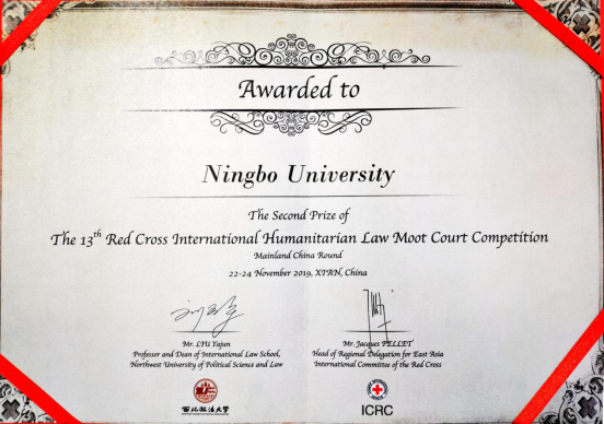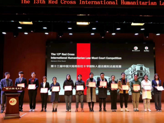2019年11月22日至24日,由红十字国际委员会、西北政法大学共同主办的第十三届中国大陆地区红十字国际人道法模拟法庭竞赛(The 13thRed Cross International Humanitarian Law Moot Court Competition Mainland China Round)在西北政法大学举行。我校首次组队参加全英文的国际模拟法庭比赛。代表队由抖阴