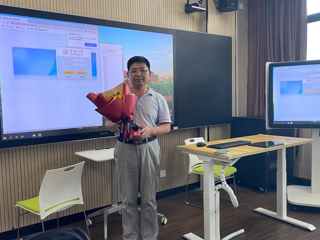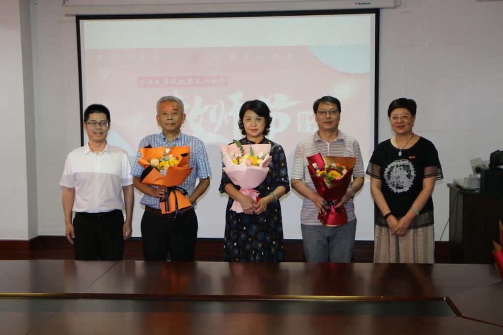 会后,为在教学一线未能到现场参加庆祝活动的蔡先凤教授送上鲜花与祝福。