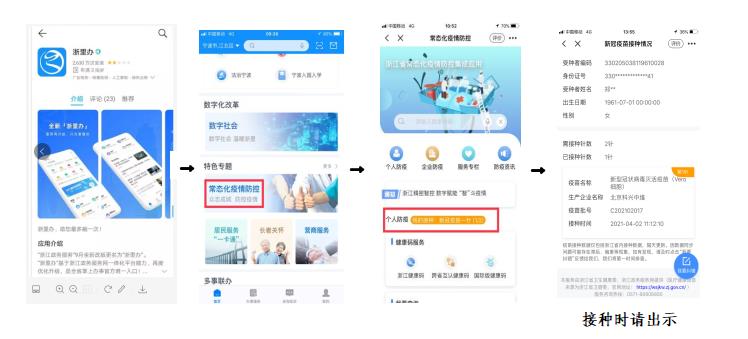 1.前往接种新冠疫苗的师生请事先在浙里办APP查询第一针接种信息,并截图保存:【浙里办】抖阴→常态化疫情防控→个人防疫:我的接种