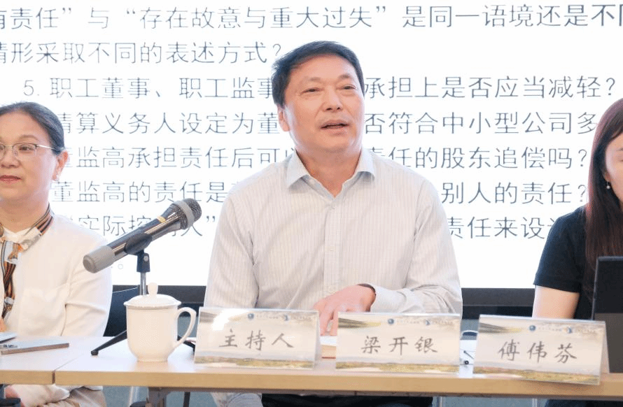 最后,郑教授引出了10个方面与谈话题供大家一起讨论。如将股东看作公司“掌门人”,董监高视作公司“守门人”,股东是公司剩余价值获得者,而董监高只是基本薪酬获取者,他们的责任内容与责任类型是否应有所区别?在一些法条中,设定了某些股东的违法行为的法律后果最终由公司与其他股东来承担,这样的制度设计是否公平合理?公司董监高需要承担较高的责任,意味着法律抬高了他们的注意义务,会对董监高,尤其是经理市场产生哪些影响?在设定董监高责任时,“负有责任”与“存在故意与重大过失”是同一语境还是不同语境,为什么公司法法条在不同情形采取不同的表述方式?清算义务人设定为董事,是否符合中小型公司多为家族企业这一中国国情?