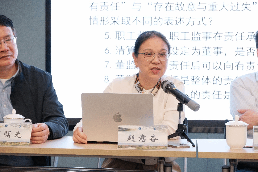 与谈人马俊彦副教授指出2023新公司法下董事的责任认定不应是静态的定性问题,而是需要动态衡量各方利益和分配责任。他提出,公司法所规定的责任体系与责任内容可以从民法典中找到出处。从民法思维出发,连带责任似乎能找到法律依据,但在细节上存在诸多值得探讨的问题,如瑕疵出资和横向人格否认制度的责任构建。他强调,董事的勤勉义务是未来研究的重点,当前法律对忠实义务关注较多,而对勤勉义务的类型化探讨不足。在赔偿责任方面,马老师表达了对新法中董事责任过重的担忧,特别是对董事对股东抽逃出资中承担连带责任的细化规定。他还提出了董事因职务行为对他人承担赔偿责任的问题。此外,马教授还关注了新《公司法》实施后的法律适用衔接问题,以及董事作为清算义务主体的责任界定问题。他提出,修改后的公司法的相关规定在有些方面与现有公司法的司法解释有所差异,《公司法》中新的规定,现有的司法解释则没有规定,应通过司法解释建立统一的裁判规则,尤其是需要通过司法解释进一步细化规则来明确董事的责任。
