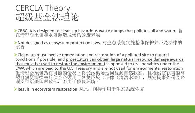 第二部分张小羽老师为我们详细介绍了《超级基金法》(CERCLA)和自然资源损害赔偿。《超级基金法》旨在清理对土壤和水资源造成污染的废弃物,对生态系统实施整体保护并不是法律的宗旨,但清理必须包括在可能的情况下将受污染场地回复到自然状态,因此,间接作用于生态系统恢复。自然资源损害赔偿金支持的恢复工作旨在将受到伤害的资源恢复到基线状态(即生态功能全面恢复),但也可补偿公众在生态环境损害发生至生态环境恢复到基线状态期间的损失。《超级基金法》的执法对象大多指向多年前已经发生的污染行为或事件,即前文所说的历史遗留污染问题。也就是说,诸如胡克化学公司在拉芙运河倾倒危险废物之类的举动在当时并不被认为是违法行为,但多年之后法律又要溯及既往追究当年过失,这在讲究程序正义高于一切的美国可想而知会面临多大的困难。正因为如此,如何设计污染责任的追溯成为《超级基金法》立法的核心。紧接着,张小羽老师又讲解了责任的类型、谁负有责任以及责任分摊的要素帮助同学们更好的理解《超级基金法》。