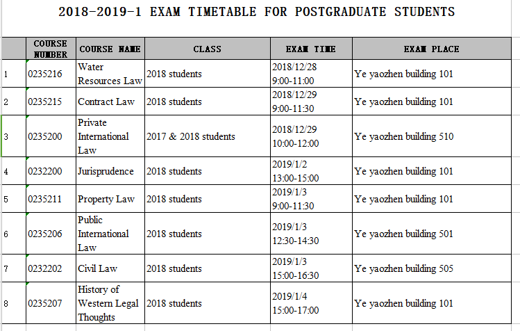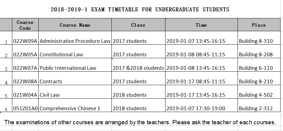 The examination time and place is shown in the table below, please pay attention! The examinations of other courses are arranged by the lecturer, and please confirm with lecturer.